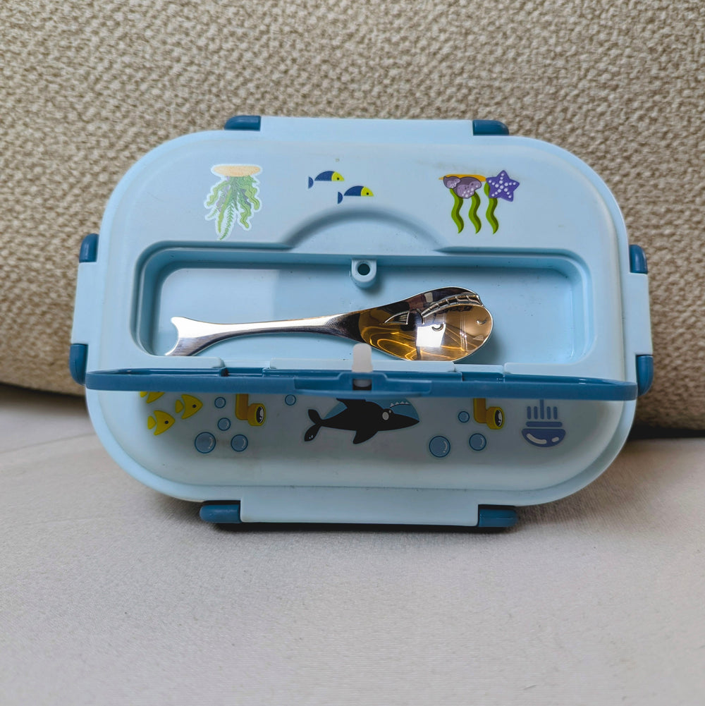 Stainless steel spoon with built-in cutlery box on top to prevent food contamination.